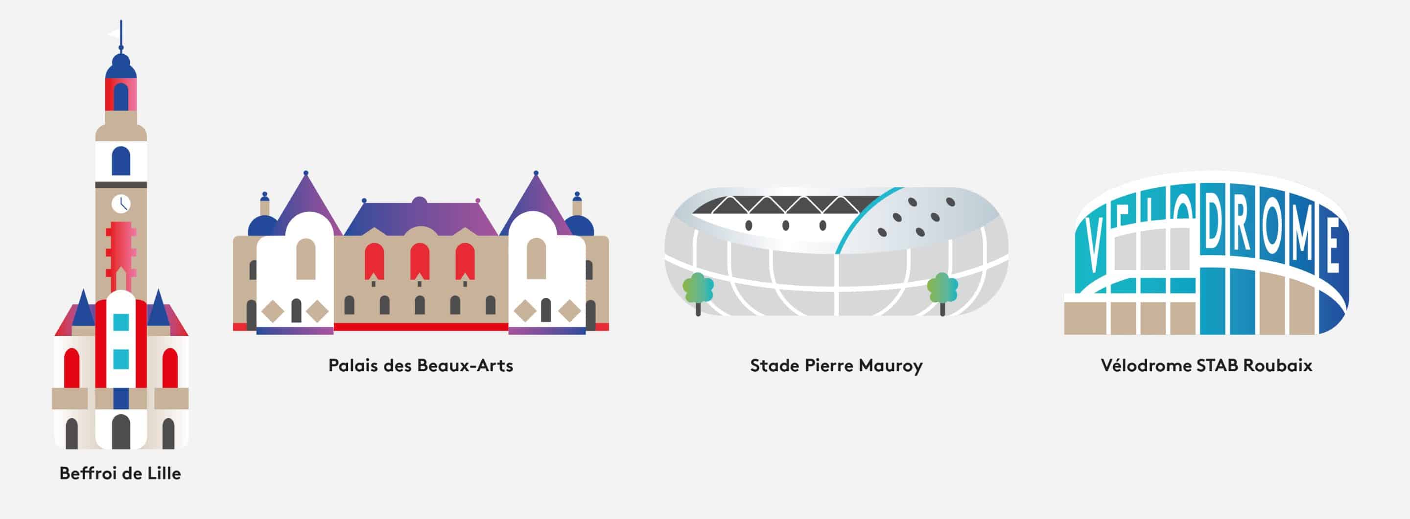 Illustrer divers éléments de l’architecture lilloise sous forme de pictogramme simple et coloré.